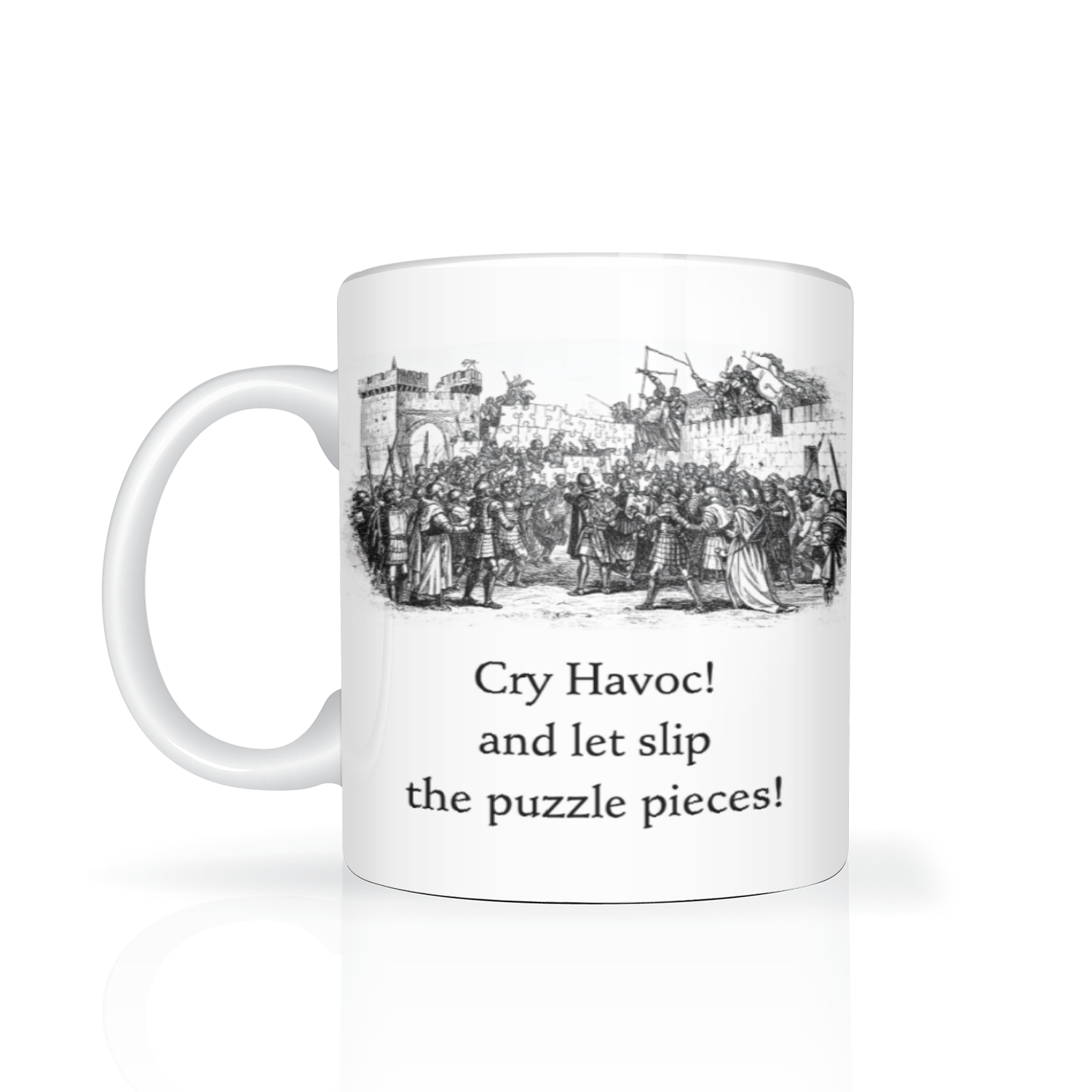 When the table is cleared and the kettle boils, the battle begins! This spirited mug pays homage to Shakespeare’s infamous rallying cry, reimagined for the noble pursuit of jigsaw warfare. Perfect for brave puzzlers, tea generals, and lovers of the absurd.