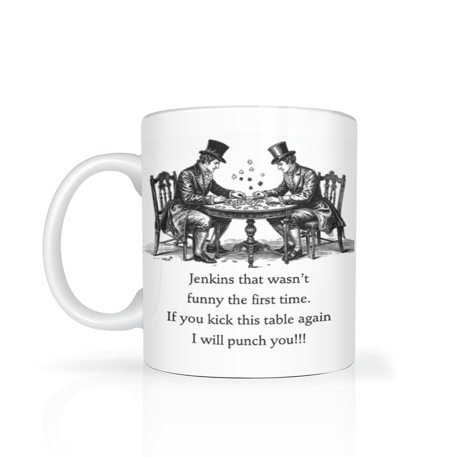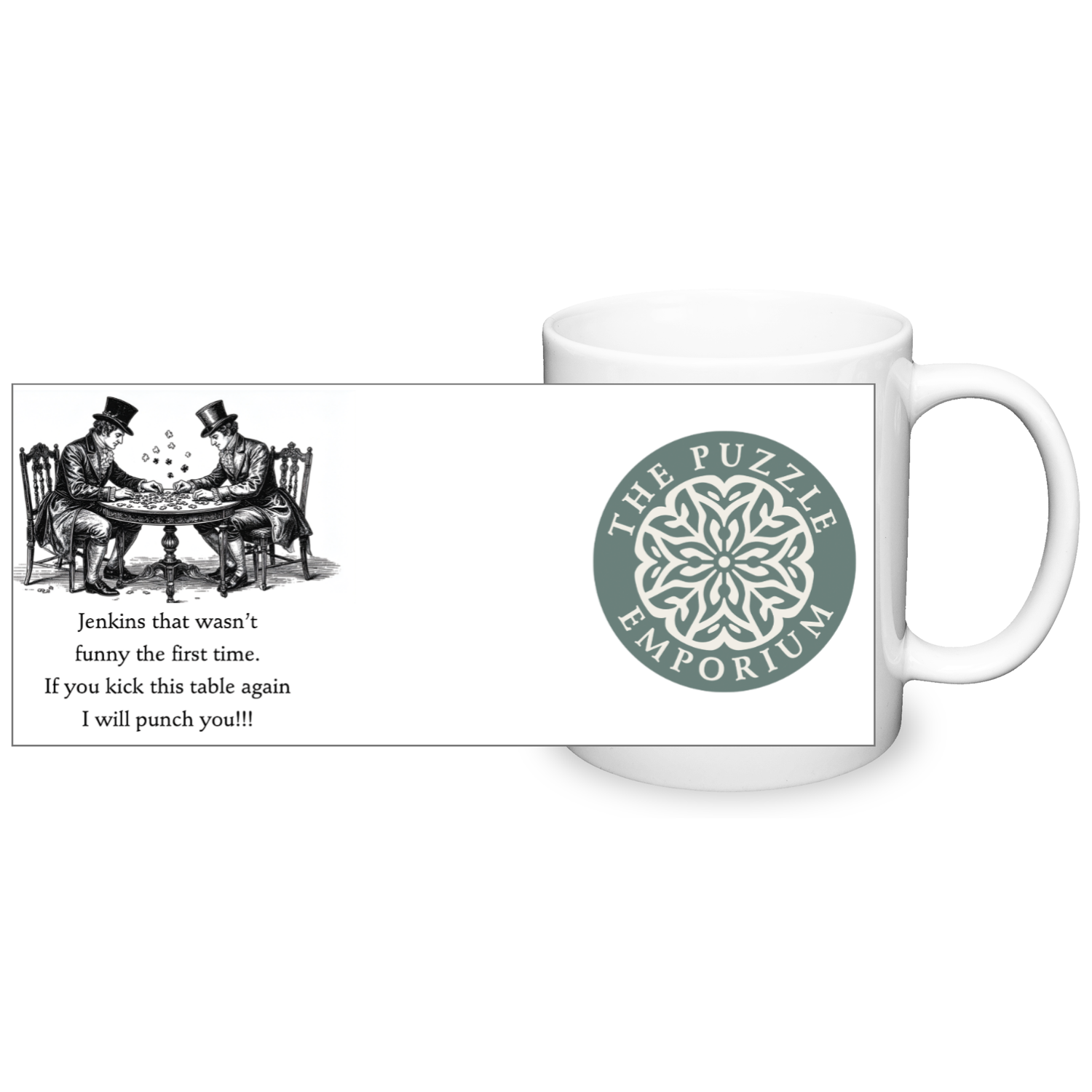 Ah, Jenkins, beloved companion and eternal table-kicker. Immortalised on this most distinguished of mugs, this scene captures the timeless frustration of shared puzzling pursuits with those of mischievous foot. A splendid gift for puzzle aficionados, lovers of dry humour, or anyone with a fondness for vintage vexations.